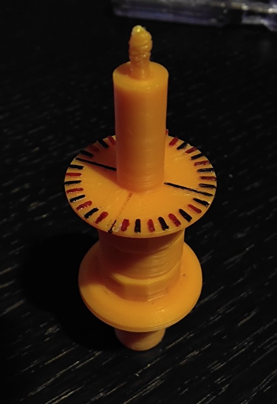 Auf der Oberseite der Nockenwellenbegrenzung habe ich im 10-Grad-Abstand kleine Marker angebracht, um die Winkel ablesen zu können, bei dem ein Kontakt beginnt, sich zu öffnen bzw. zu schließen. Außerdem sind die Stellen mit der maximalen und minimalen Auslenkung der Nocke markiert. Somit ist es möglich, die Kontakte so genau einzustellen, dass die Öffnungs- und Schließ-Winkel bei beiden Kontakten möglichst gleich ist, bzw. es lässt sich damit festellen, ob ein Kontakt bzw. die Kontakt-Nocke stärker abgenutzt ist, als die andere, so wie das z.B. bei einem meiner Gebisse der Fall ist. Durch die Öffnungen oben ist es theoretisch auch möglich, die Kontakte direkt einzustellen, wobei ich aber denke, dass es einfacher ist, das Gebiss herauszunehmen, zu justieren und dann wieder im eingesteckten Zustand zu überprüfen.
