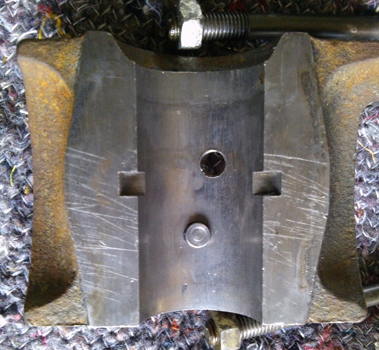 Wenn man das Gelenk von außen gesäubert, den Splint entfernt und die Verschlußschraube samt Feder, Lagerpfannenscheibe und altem Fett raus hat, guckt ein Kugelstummel raus, der wohl seit 40 Jahren endlich wieder Tageslicht sieht. Leider ist er - weil er auf der Gegenseite eingepresst ist - nur aus dieser Perspektive sicht- und beurteilbar:
